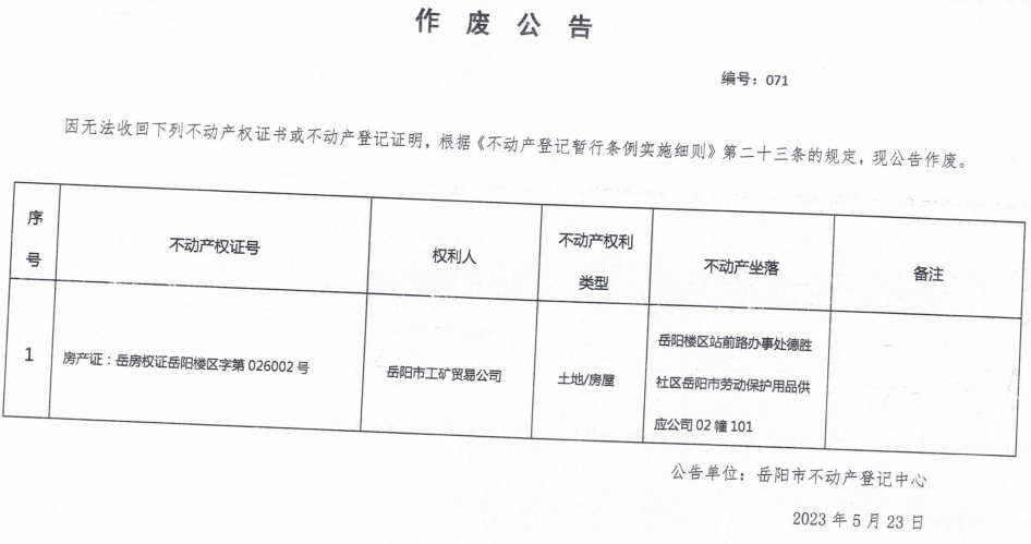 作废公告 编号:071(岳阳市工矿贸易公司)