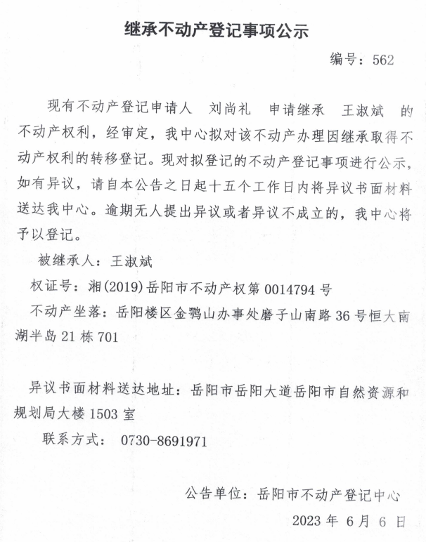 继承不动产登记公示 编号:刘尚礼(562)