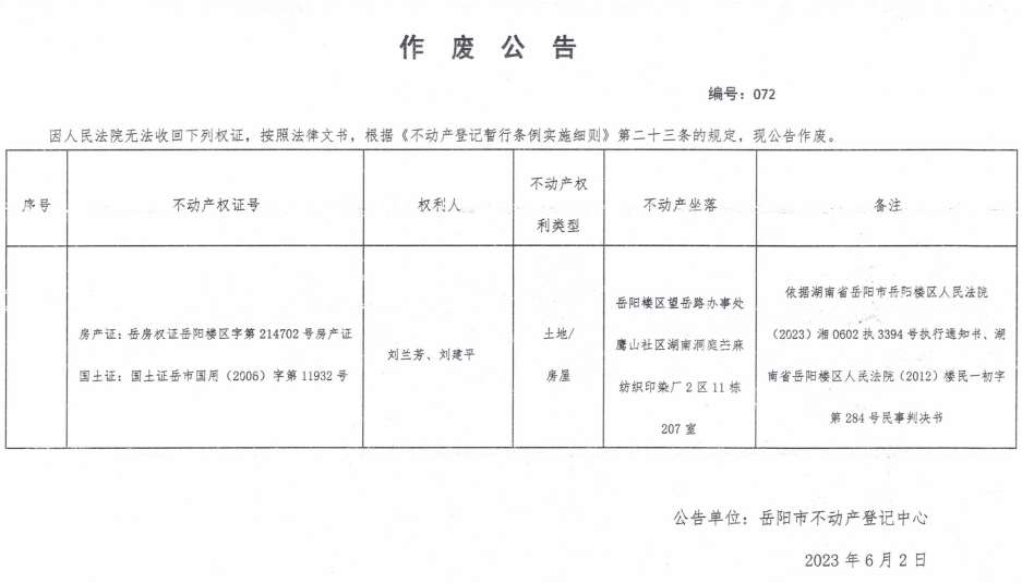 作废公告 编号:072(刘兰芳、刘建平)