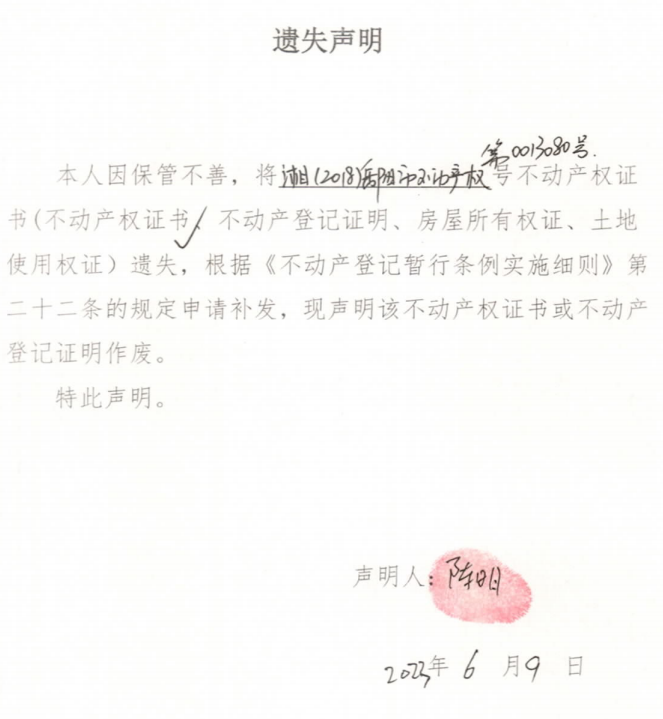遗失声明(陈明)