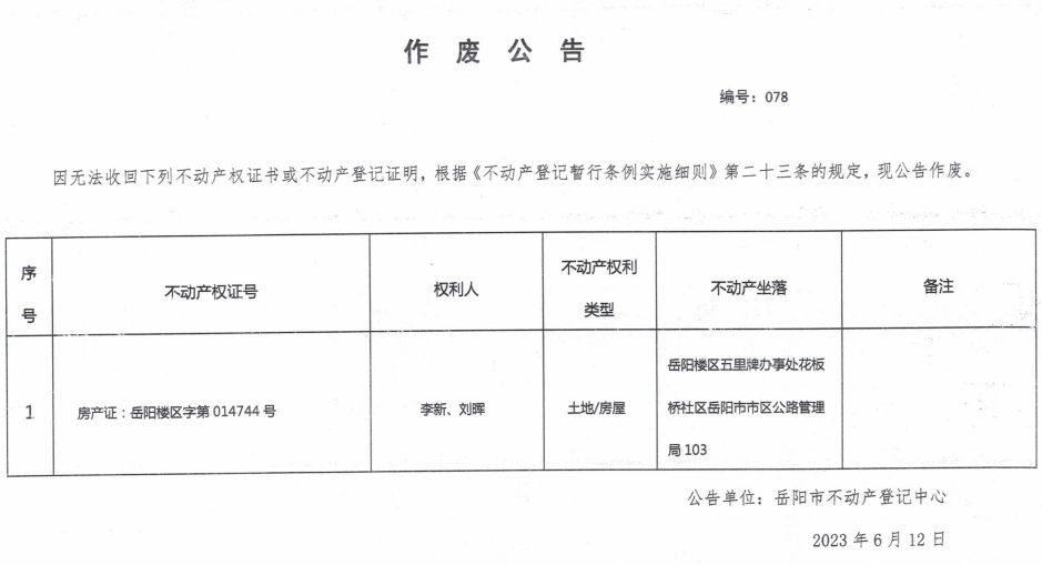 作废公告 编号:078(李新、刘晖)