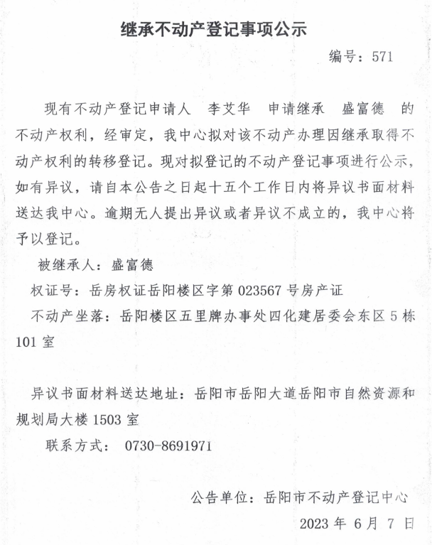 继承不动产登记公示 编号:李艾华(571)