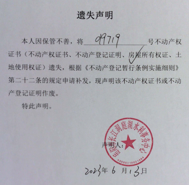 遗失声明(岳阳市长江洞庭湖水利事务中心)