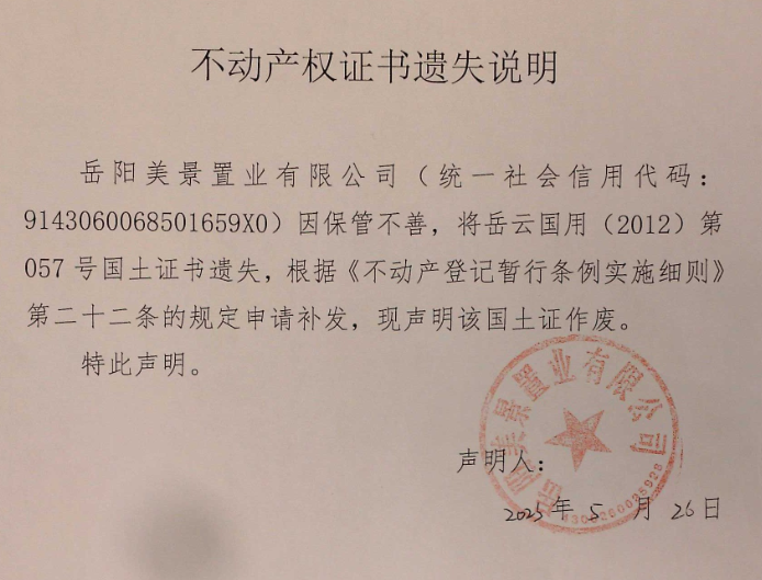 不动产权证书遗失公示(岳阳美景置业有限公司)
