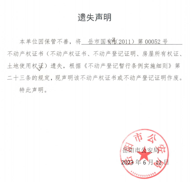 遗失声明 (岳阳市公安局)