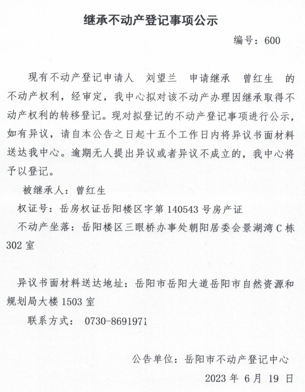 继承不动产登记公示 编号:刘望兰(600)