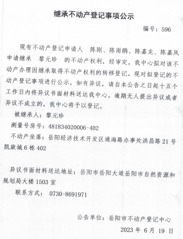 继承不动产登记公示 编号:陈雨鹃、陈嘉龙、陈嘉凤 陈正伟(596)