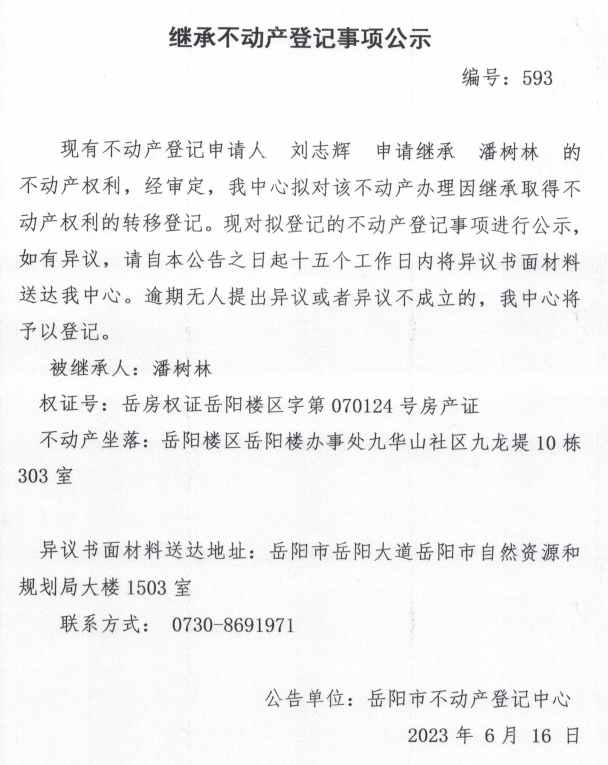 继承不动产登记公示 编号:刘志辉(593)