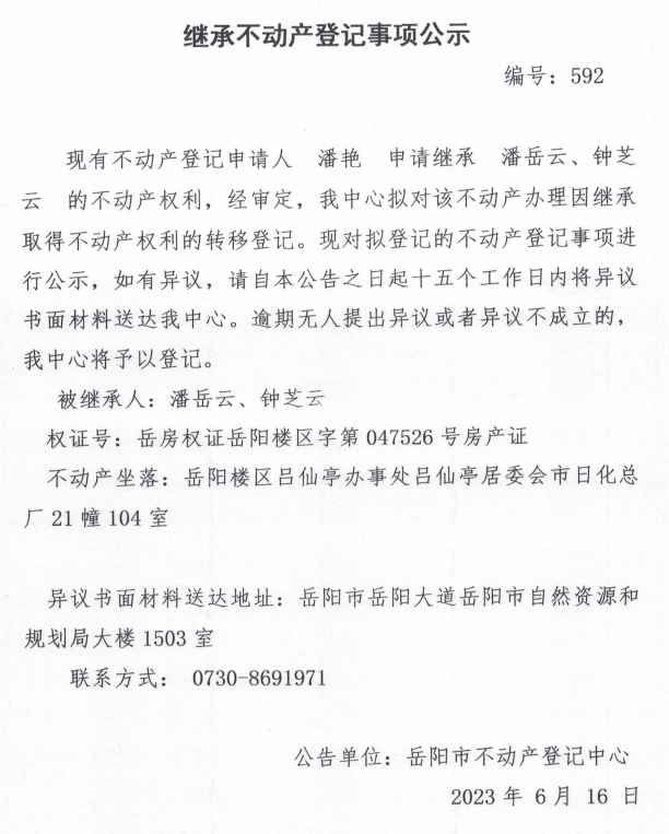 继承不动产登记公示 编号:潘艳(592)