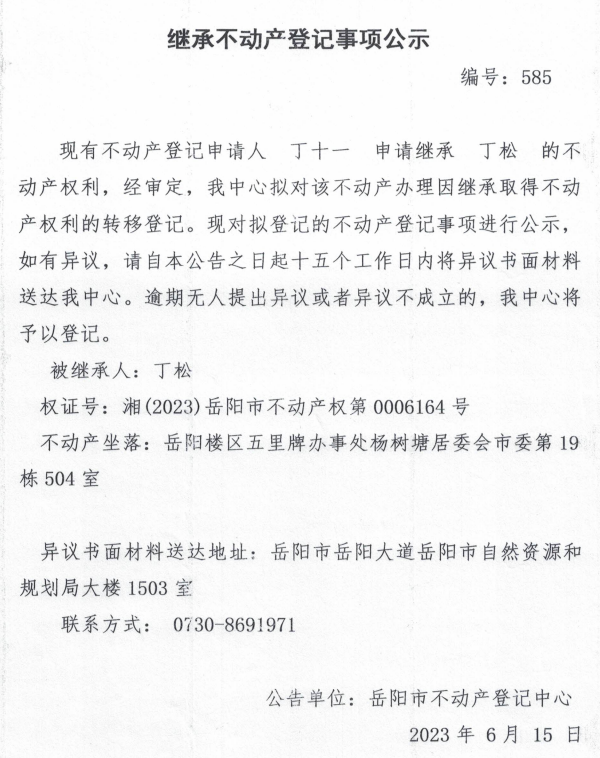 继承不动产登记公示 编号:丁十一(585)