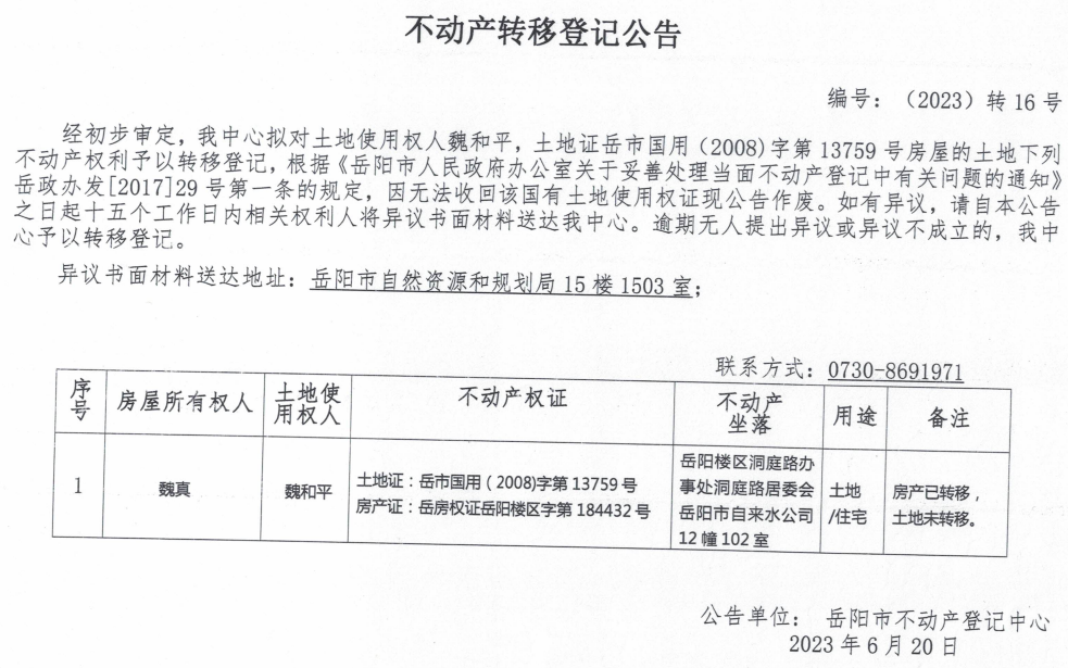不动产转移登记公告 编号:转16(魏和平)