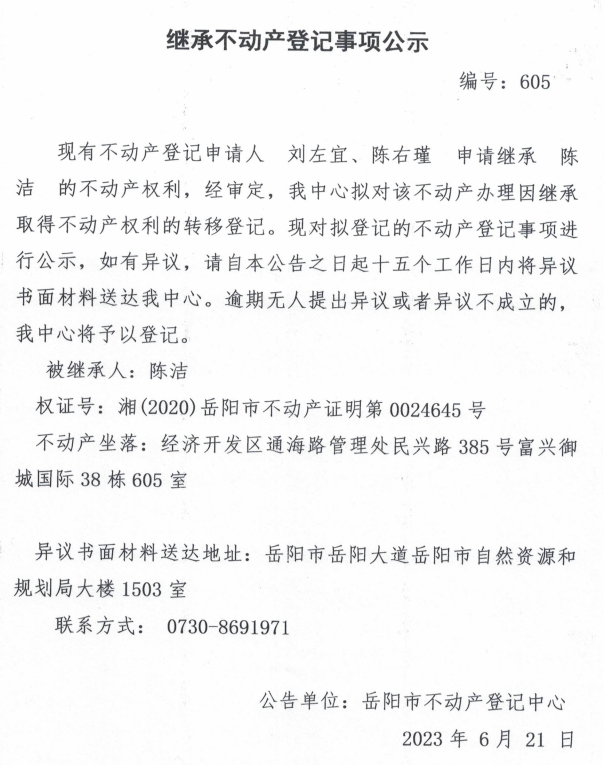 继承不动产登记公示 编号:刘左宜、陈右瑾(605)