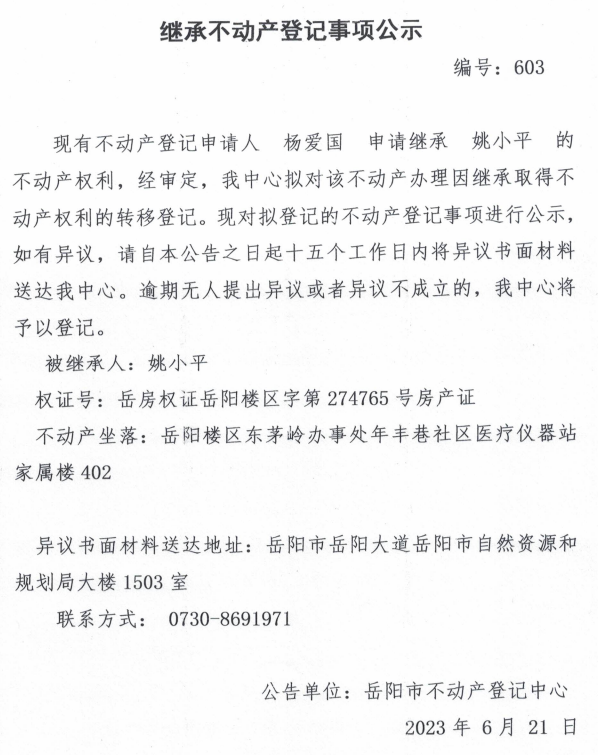 继承不动产登记公示 编号:杨爱国(603)