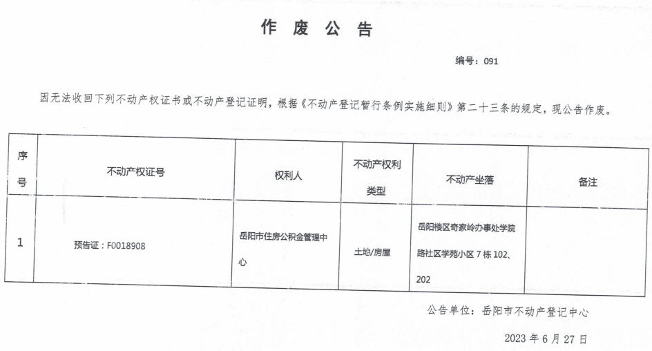 作废公告 编号:091(岳阳市住房公积金管理中心)