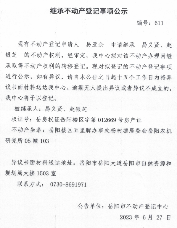 继承不动产登记公示 编号:611(易亚余)