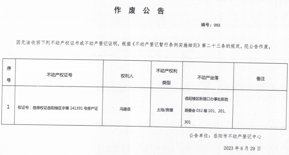 作废公告 编号:093(冯建岳)