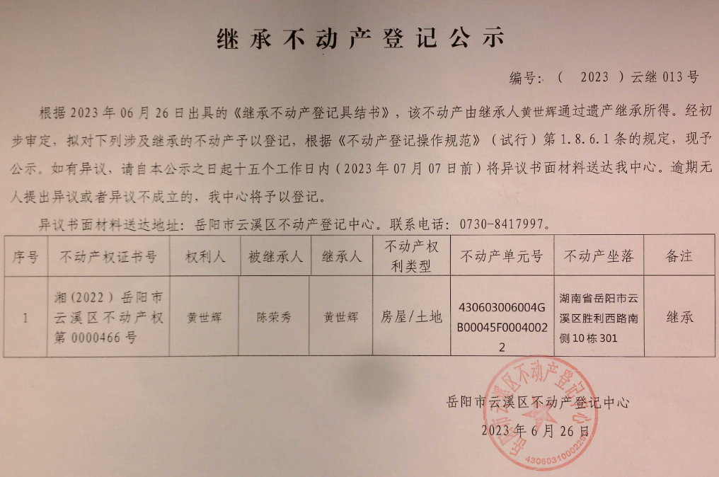 继承不动产登记公示 编号:(2023) 云继013号