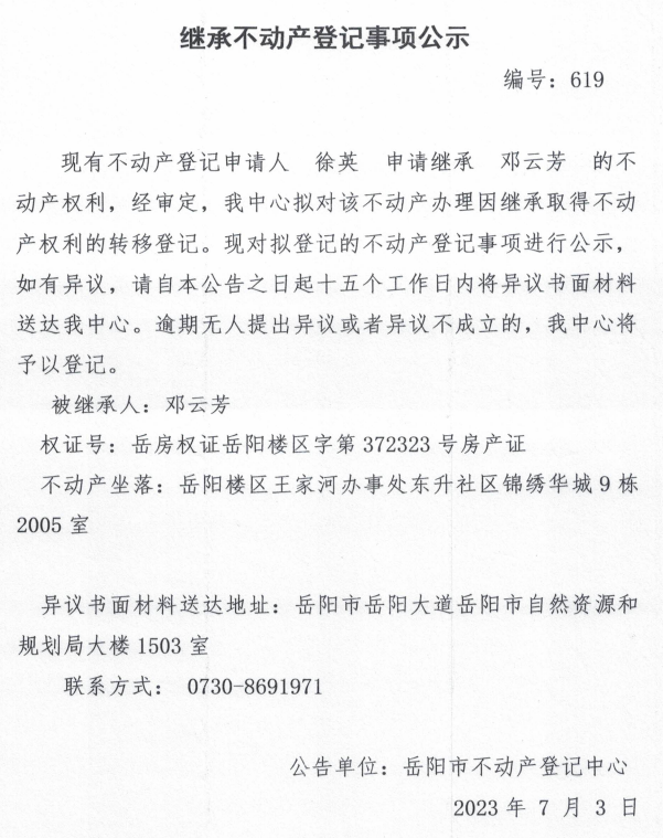 继承不动产登记公示 编号:徐英(619)