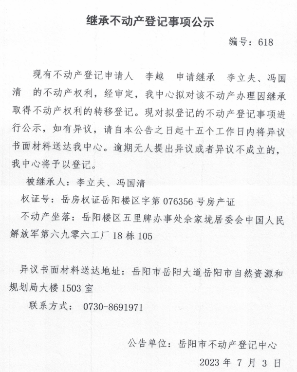 继承不动产登记公示 编号:李越(618)