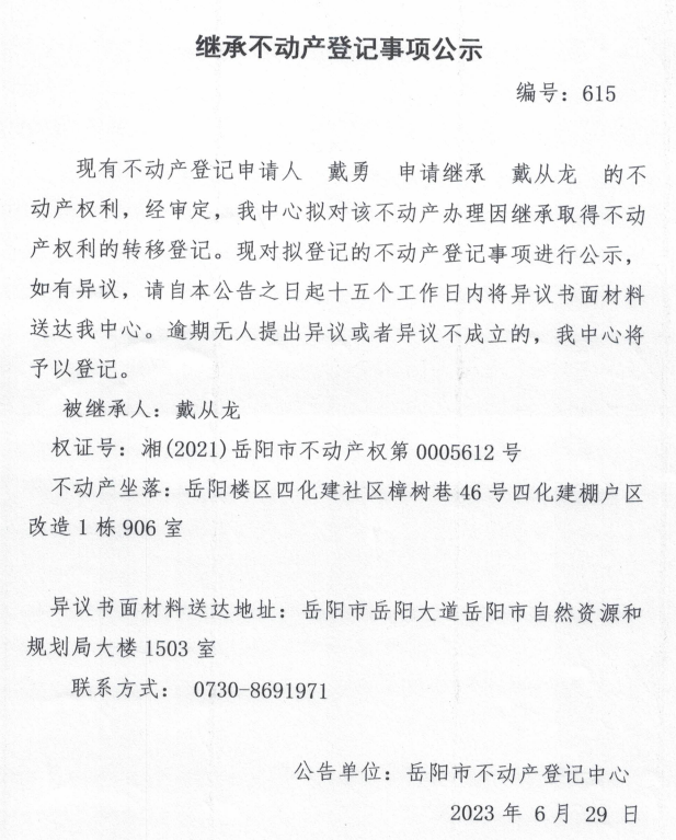 继承不动产登记公示 编号:戴勇(615)