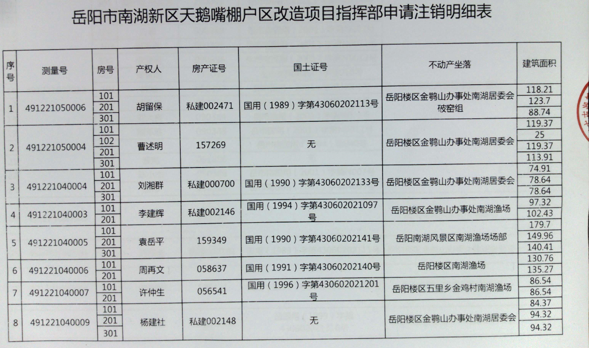 岳阳市南湖新区天鹅嘴棚户区改造项目指挥部申请注销明细表