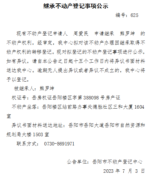 继承不动产登记公示 编号:周爱民(625)