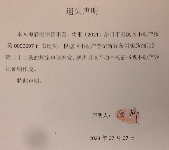 不动产权证书遗失公示(梅静)