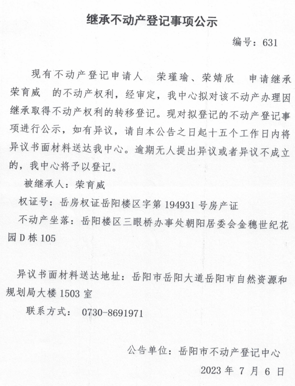 继承不动产登记公示 编号:荣瑾瑜、荣婧欣(631)