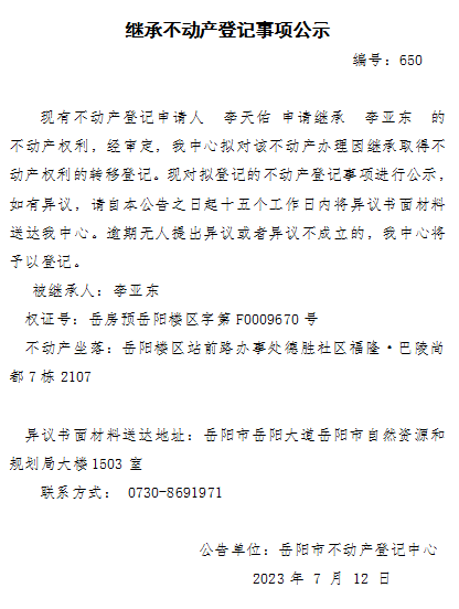 继承不动产登记公示 编号:李天佑(650)