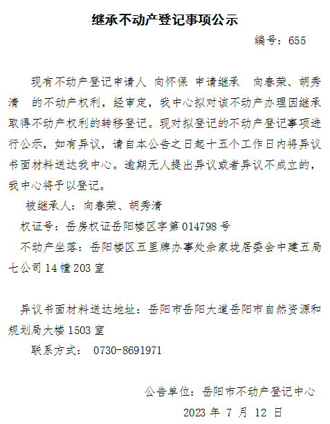 继承不动产登记公示 编号: 向怀保(655)