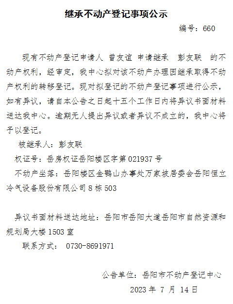 继承不动产登记公示 编号:曾友谊(660)