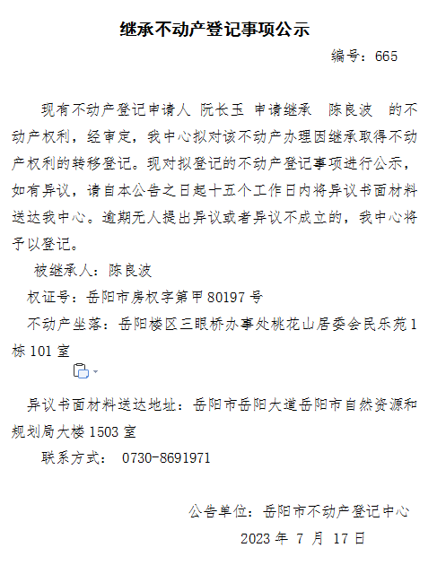 继承不动产登记公示 编号:阮长玉(665)