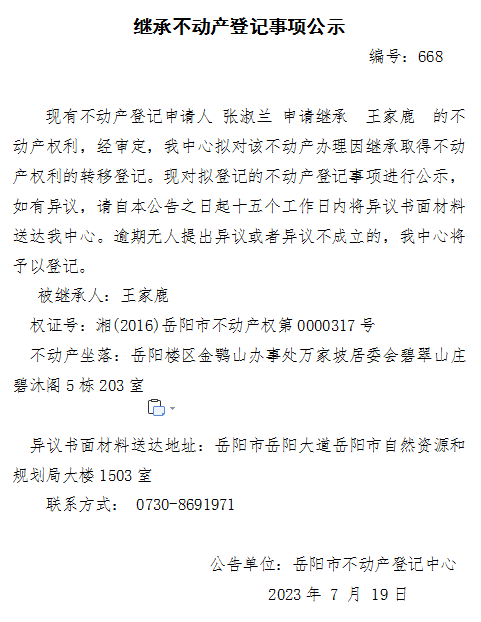 继承不动产登记公示 编号:张淑兰(668)