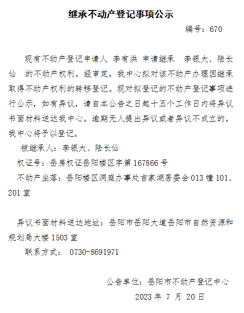 继承不动产登记公示 编号:李有洪(670)