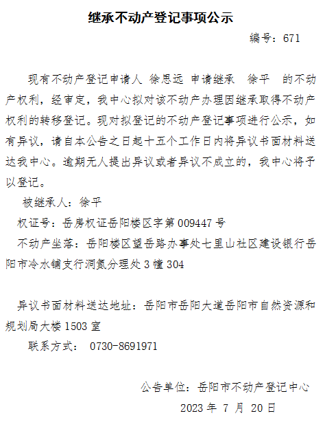 继承不动产登记公示 编号:徐思远(671)