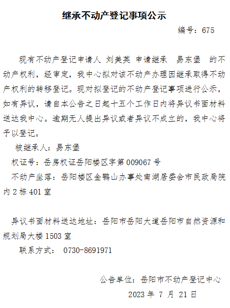 继承不动产登记公示 编号:刘美英(675)