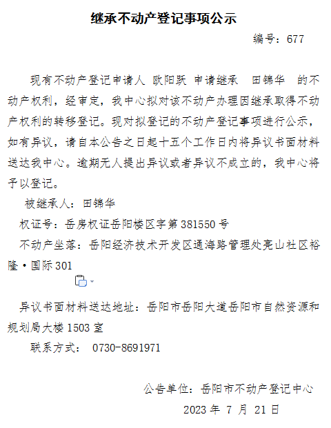 继承不动产登记公示 编号:欧阳跃(677)