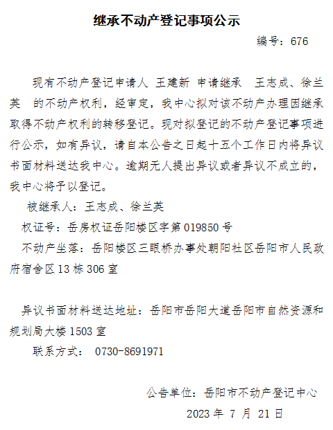 继承不动产登记公示 编号:王建新(676)