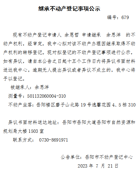 继承不动产登记公示 编号:余恩哲(679)