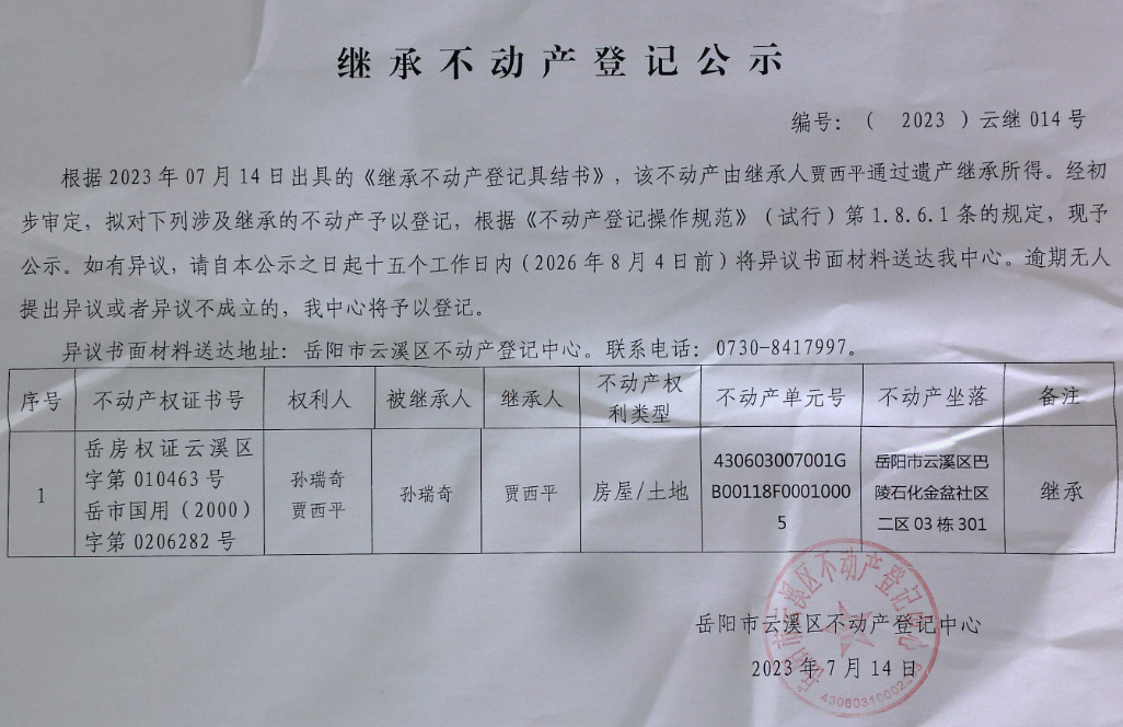 继承不动产登记公示 编号:(2023) 云继014号