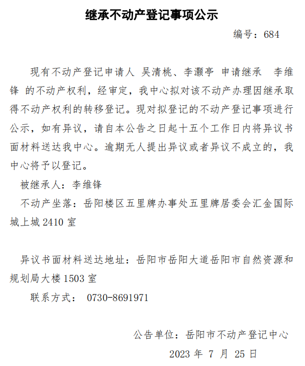 继承不动产登记公示 编号:吴清桃、李灏亭(684)
