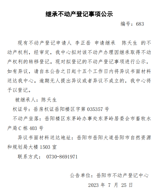 继承不动产登记公示 编号:李正岳(683)