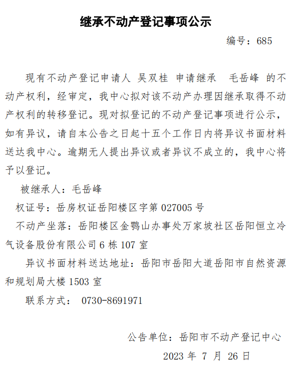 继承不动产登记公示 编号:吴双桂(685)