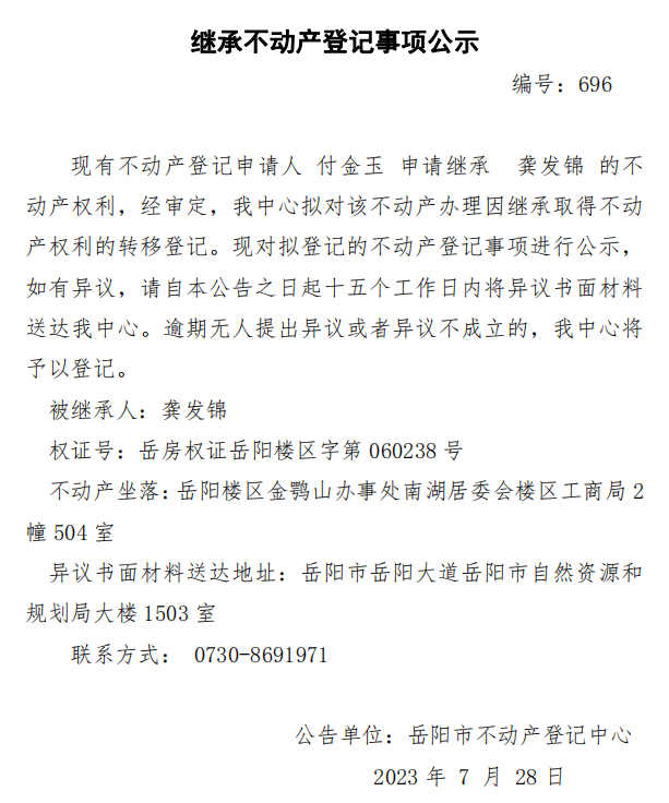 继承不动产登记公示 编号:付金玉(696)