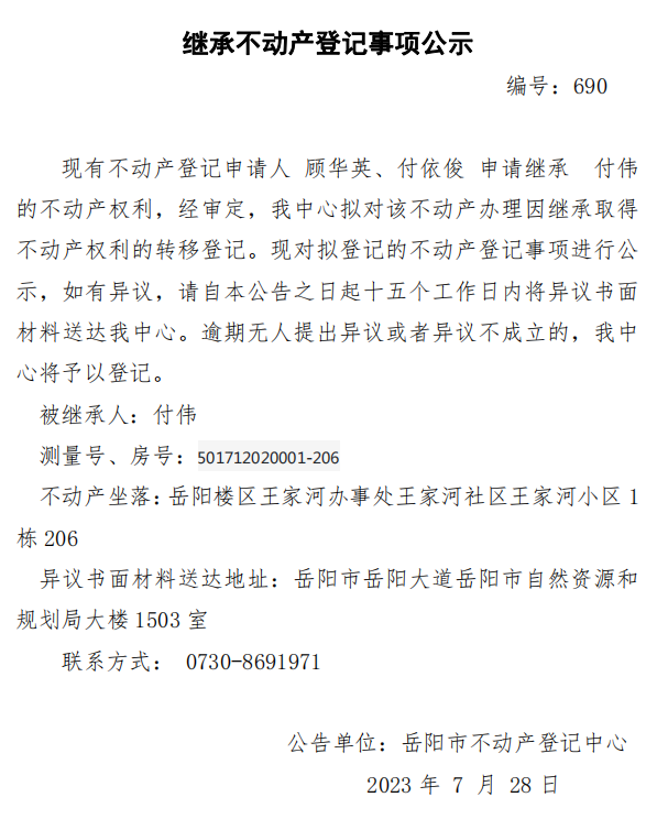 继承不动产登记公示 编号:顾华英、付依俊(690)