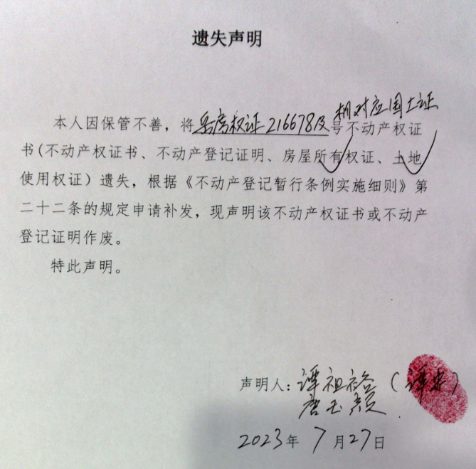 遗失声明 (谭祖裕、唐玉颜)