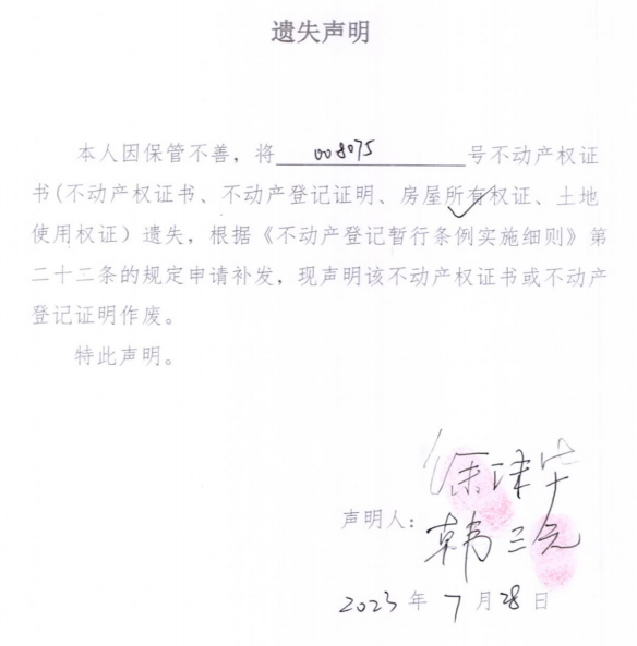 遗失声明(徐沫华、韩三元)