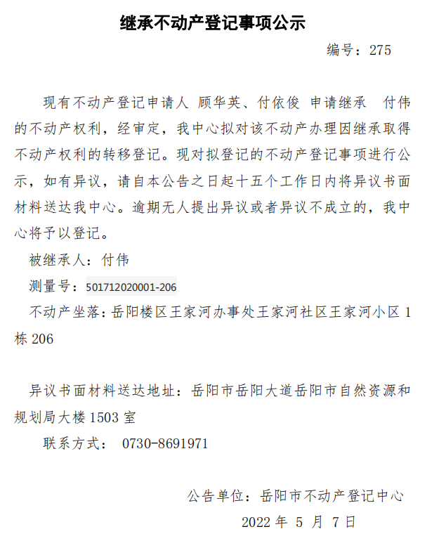 继承不动产登记公示 编号:顾华英、付依俊(275)
