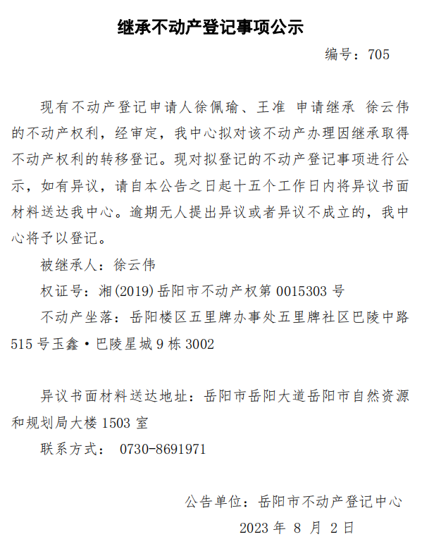继承不动产登记公示 编号:徐佩瑜、王准(705)