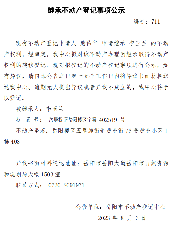 继承不动产登记公示 编号:熊佑华(711)